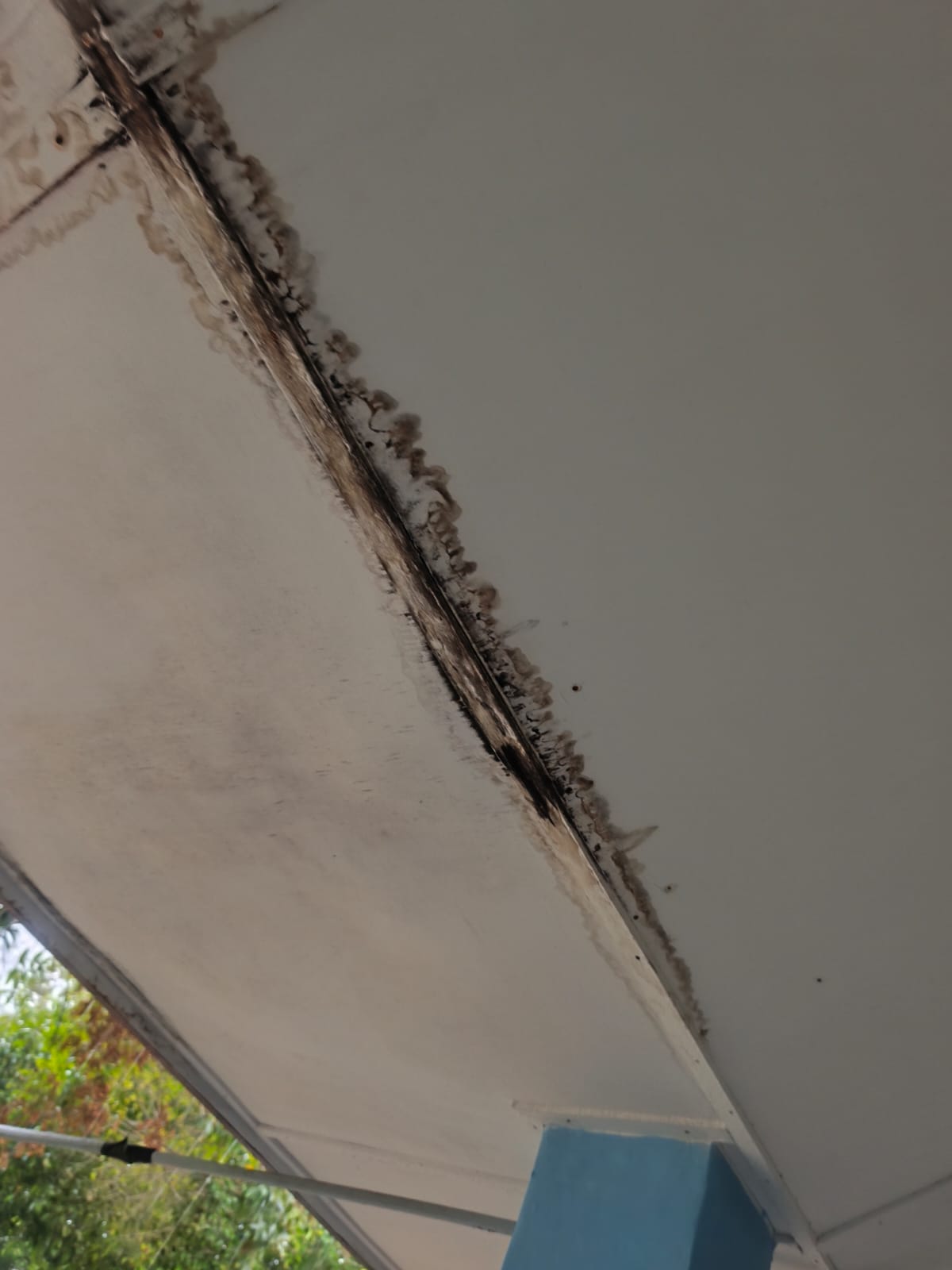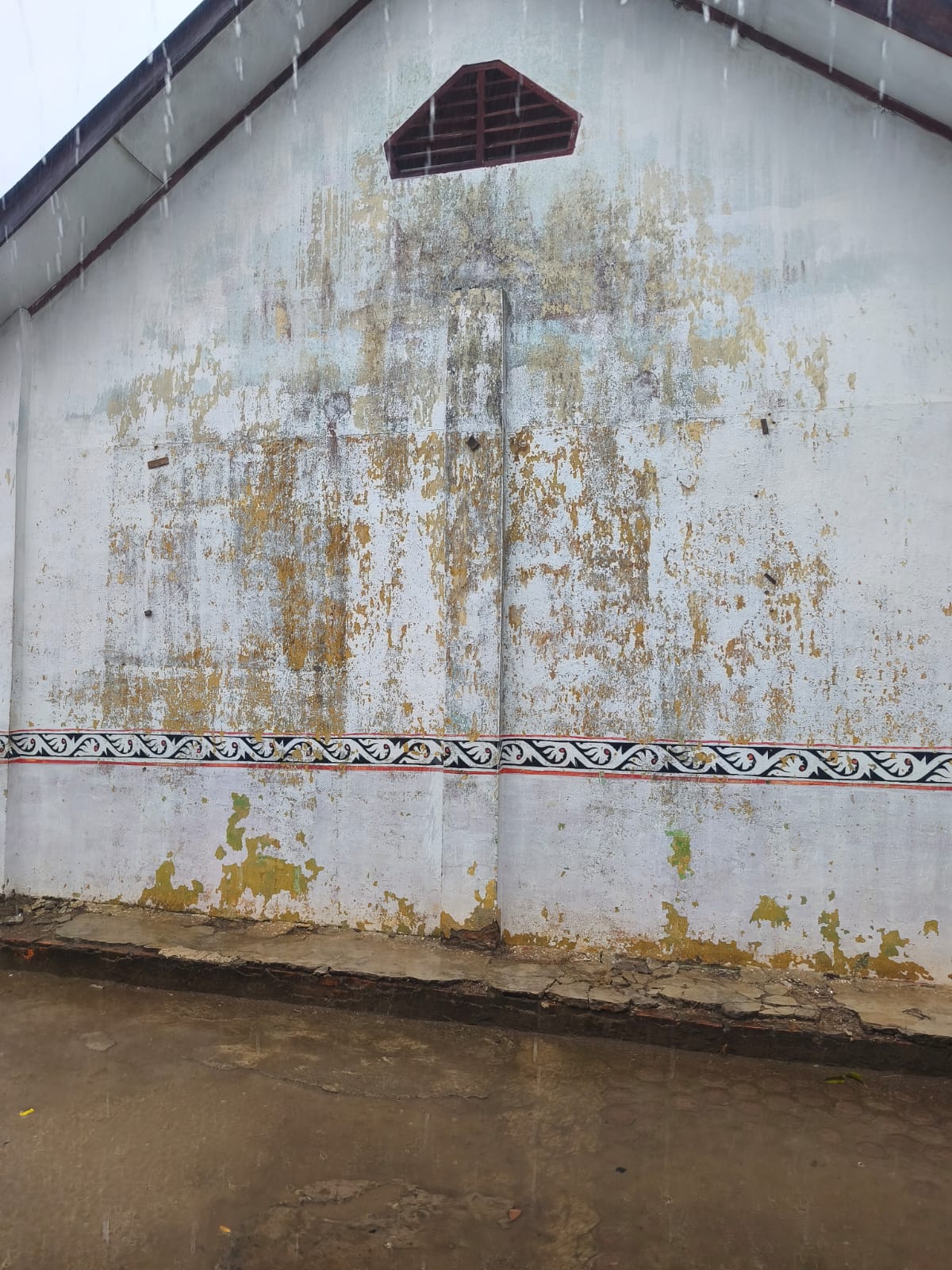 Dari hasil dokumentasi, terlihat atap bangunan mengalami kebocoran parah dengan bekas rembesan air yang menghitam dan dipenuhi jamur. Dinding sekolah tampak kusam, cat mengelupas di berbagai sisi, bahkan sebagian area terlihat seperti tidak pernah tersentuh perawatan. Ironisnya, lantai di beberapa titik rusak dan tergenang air saat hujan turun.