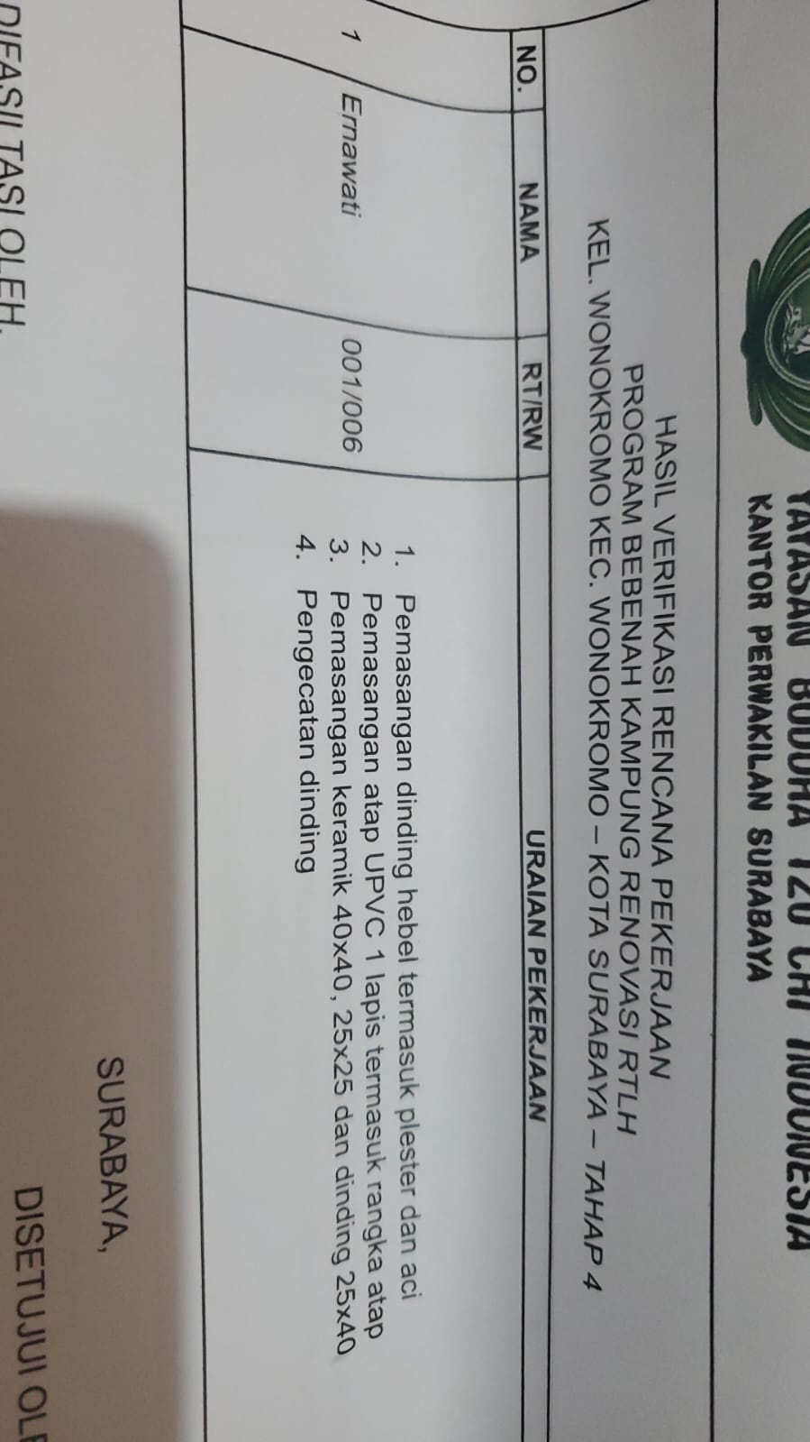 Surabaya — Pelaksanaan program bantuan bedah rumah oleh Yayasan Budha Tzu Chi Perwakilan Surabaya di wilayah Jetis Kulon, Kelurahan Wonokromo, Kecamatan Wonokromo, menuai sorotan tajam dari masyarakat. Program yang seharusnya memberikan hunian layak bagi warga berpenghasilan rendah justru diduga dikerjakan secara asal-asalan dan tidak memenuhi standar teknis bangunan.
