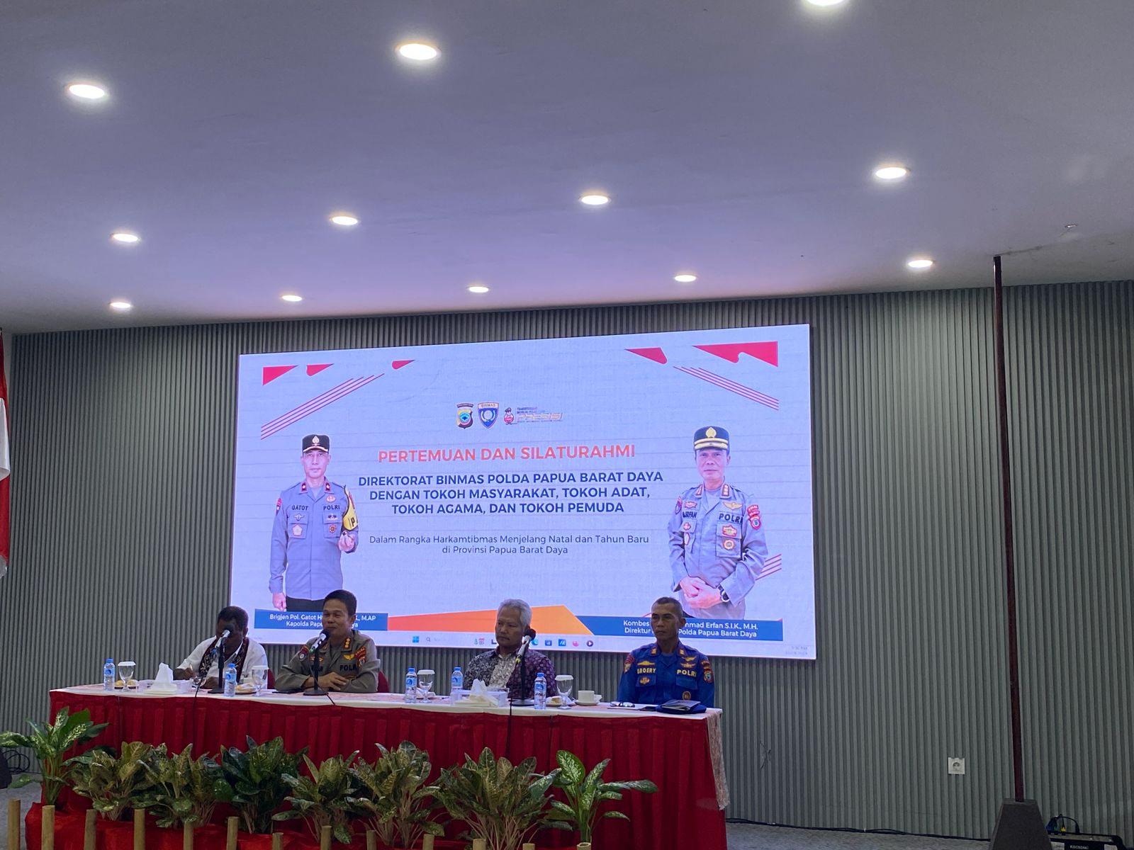 Sorong,26 November 2025 Dalam rangka menjaga stabilitas keamanan dan ketertiban masyarakat (kamtibmas) menjelang perayaan Natal 2025 dan Tahun Baru 2026, Direktorat Binmas Polda Papua Barat Daya menggelar pertemuan dan silaturahmi bersama Tokoh Masyarakat, Tokoh Adat, Tokoh Agama, serta Tokoh Pemuda di salah satu hotel di Kota Sorong, Rabu .