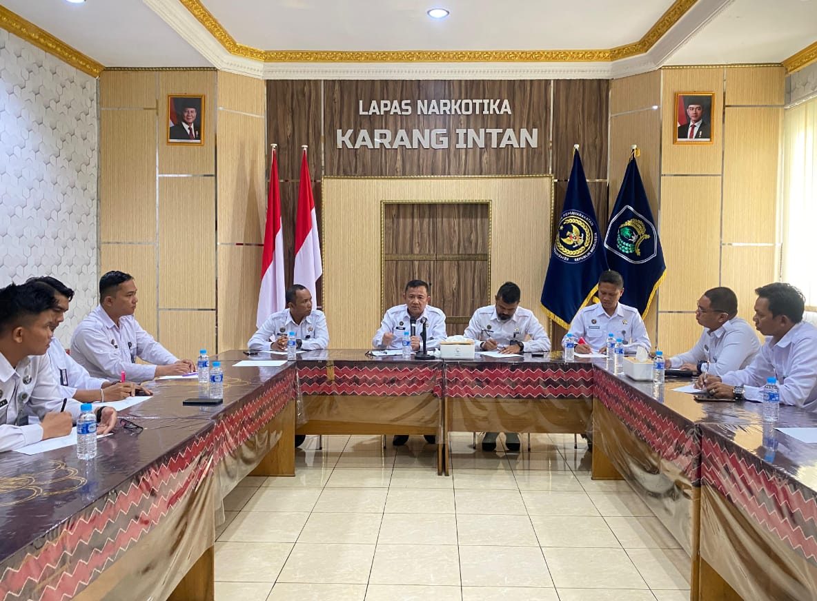 Kepala Lembaga Pemasyarakatan (Kalapas) Narkotika Kelas IIA Karang Intan, Yugo Indra Wicaksi, memimpin briefing bersama jajaran Seksi Kegiatan Kerja (Giatja) yang melibatkan Kasi Giatja, Kasubsi Bimbingan Kerja (Bimker) dan LohasKer, Kasubsi Sarana Kerja, serta staf pelaksana, di Aula Atas Lapas Narkotika Karang Intan, Senin (6/10). Kegiatan ini membahas langkah strategis peningkatan pembinaan kemandirian warga binaan melalui optimalisasi lahan pertanian dan penguatan kegiatan ekonomi produktif.