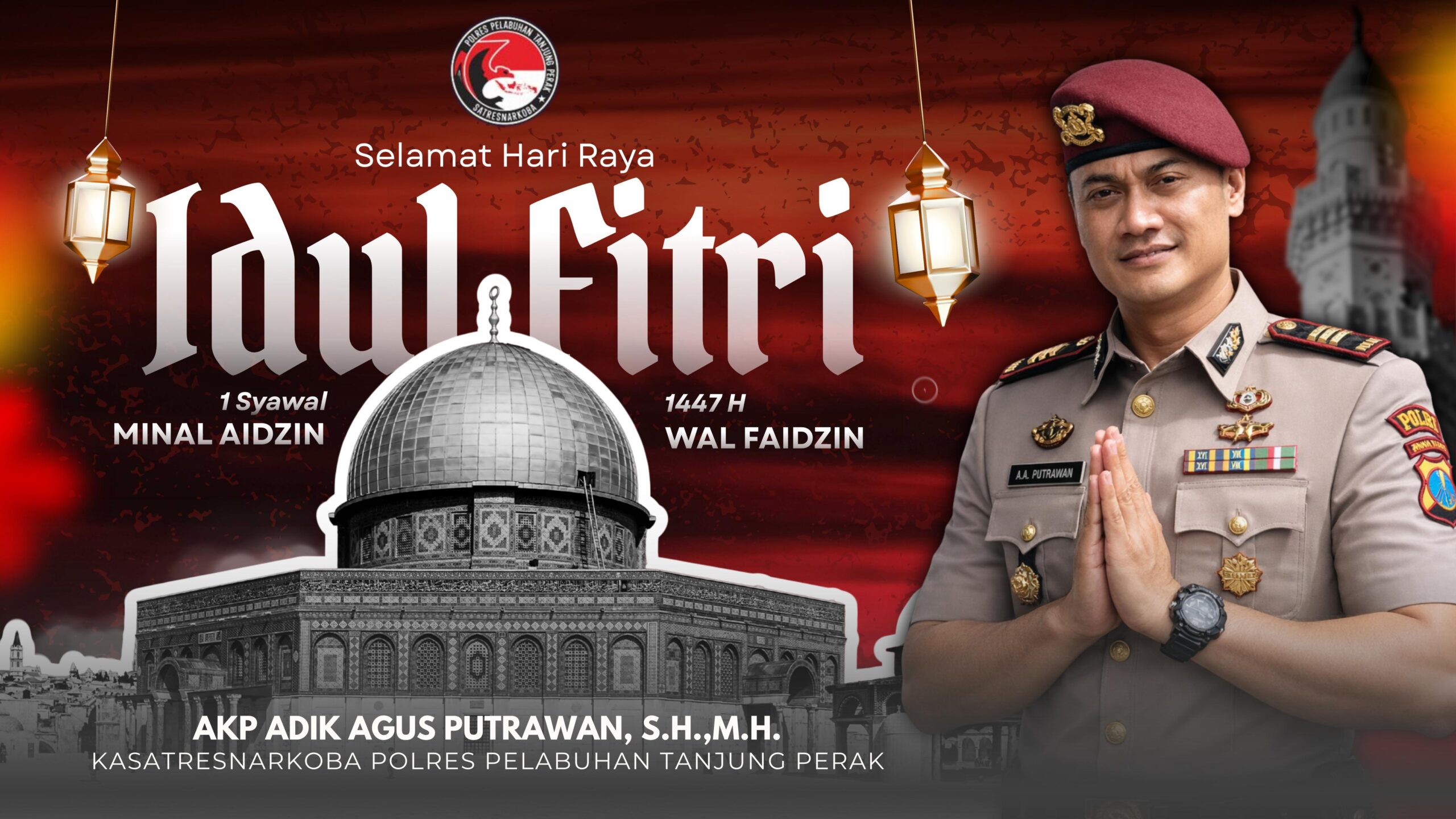 Kasatresnarkoba Polres Pelabuhan Tanjung Perak, AKP Adik Agus Putrawan, S.H., M.H., menyampaikan ucapan “Selamat Hari Raya Idul Fitri 1447 H, Minal Aidzin Wal Faidzin, mohon maaf lahir dan batin” kepada seluruh masyarakat, seraya mengajak semua pihak menjadikan Idul Fitri sebagai momentum memperbaiki diri dan memperkuat kepedulian sosial.