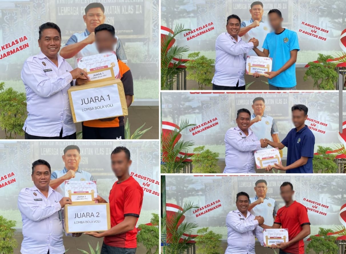 Kepala Subbagian Tata Usaha (Kasubag TU) Lapas Kelas IIA Banjarmasin, Hutan Triwibowo, menyerahkan piagam penghargaan dan hadiah kepada para pemenang Lomba Bola Voli dalam rangka Pekan Lomba Kemerdekaan HUT ke-80 Republik Indonesia, Selasa (19/08) pagi.