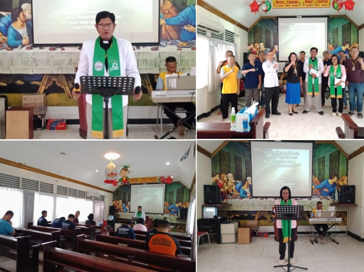 Suasana penuh hikmat menyelimuti Gereja Oikumene Lapas Kelas IIA Banjarmasin saat dilaksanakan ibadah rutin bulanan pelayanan dari Gereja Protestan Indonesia Barat (GPIB) “Maranatha”, Selasa (16/09). Seluruh Warga Binaan Pemasyarakatan (WBP) Kristiani hadir bersama Pembina Gereja Oikumene untuk menaikkan pujian penyembahan dan mendengarkan khotbah yang dibawakan oleh Pdt. Jonathan Marco F. Simanjuntak, S.Th.