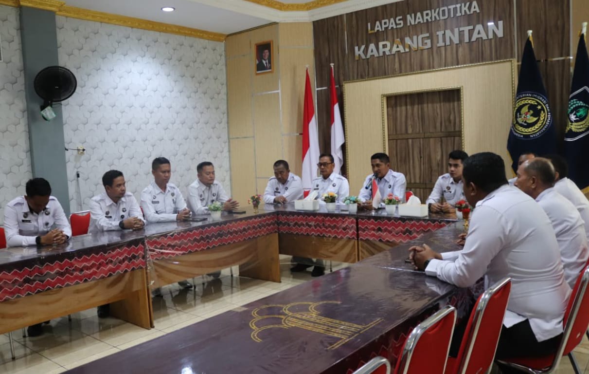 Kepala Lapas Narkotika Kelas IIA Karang Intan, Edi Mulyono, memimpin rapat koordinasi terkait pengelolaan Wartelsuspas, Senin (8/9). Rapat yang berlangsung di Aula Lapas dimulai pukul 09.45 WITA ini diikuti jajaran pejabat struktural, staf KPLP, KaRupam, dan WaKaRupam.