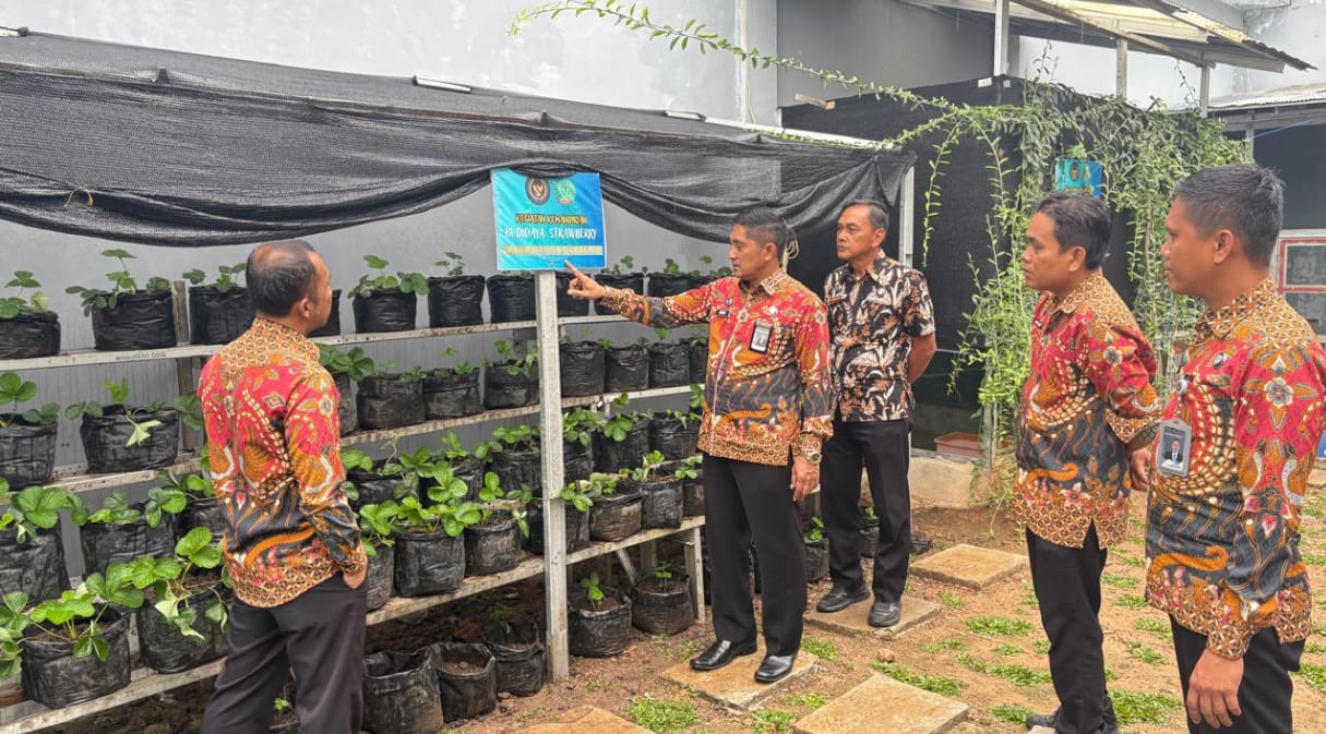 Kepala Lapas Narkotika Kelas IIA Karang Intan, Edi Mulyono, bersama jajaran pejabat struktural meninjau langsung kegiatan budidaya stroberi oleh Warga Binaan (WB) dengan pendampingan staf Giatja. Kamis (28/8).