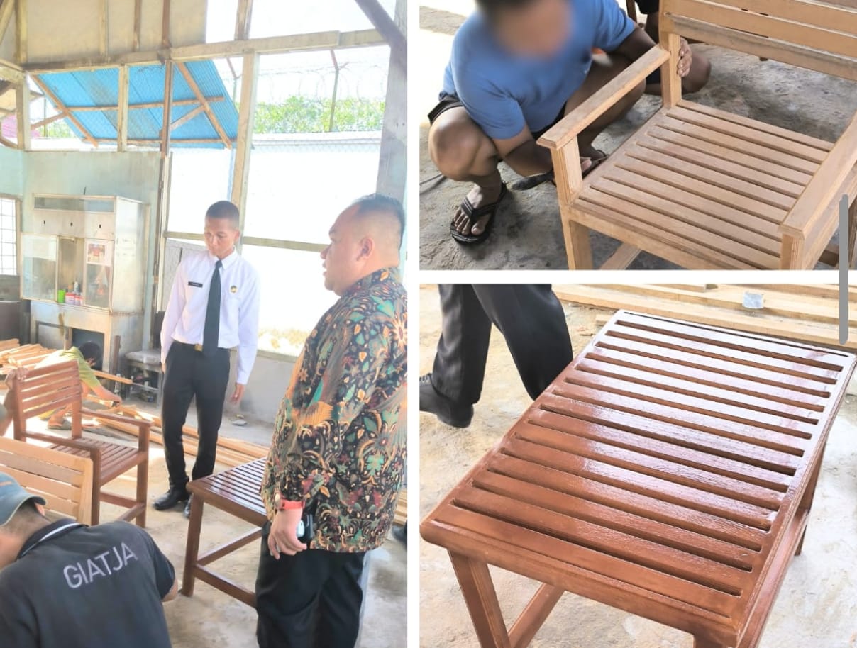 Program pembinaan kemandirian di Lembaga Pemasyarakatan (Lapas) Kelas IIA Banjarmasin terus berjalan aktif. Pada Jumat (11/07), sejumlah petugas melaksanakan pengawasan rutin terhadap pelaksanaan kegiatan kerja warga binaan di Workshop Lapas yang memproduksi aneka furniture seperti kursi dan meja.