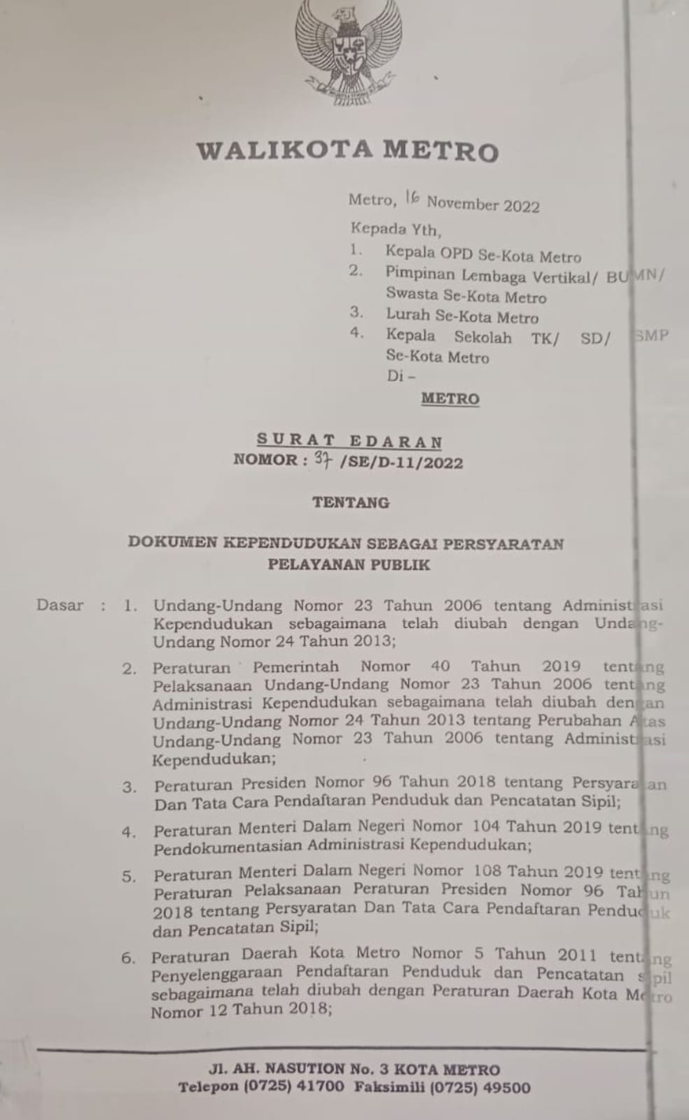 Yang jadi kesusahan kami, Kelurahan di Kota Metro tidak mau mengeluarkan Surat Keterangan Domisili karena ada Perwali yang melarangnya, sedangkan dari Sekolah dan dinas Pendidikan mewajibkan menggunakan domisili untuk pendaftaran melalui jalur Mutasi