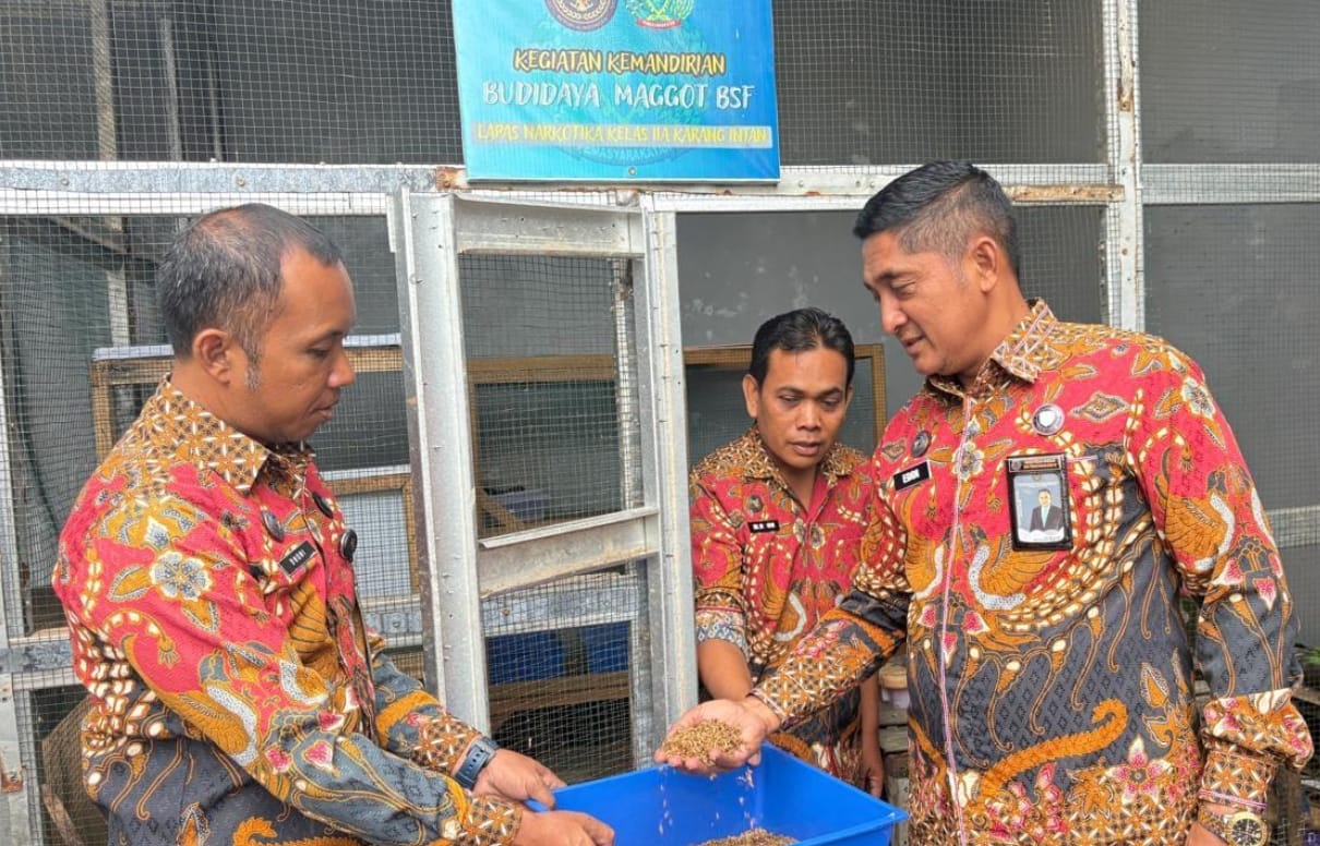 Kepala Lembaga Pemasyarakatan (Kalapas) Narkotika Kelas IIA Karang Intan, Edi Mulyono, bersama pejabat struktural meninjau kegiatan budidaya maggot yang dikelola di Wahana Asimilasi dan Edukasi (WAE), Kamis (28/8). Kegiatan ini menjadi salah satu upaya Lapas dalam mendukung program ketahanan pangan serta pengelolaan lingkungan yang berkelanjutan.